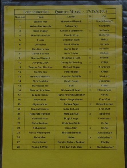 | Der VCL-Turniersommer wurde auch im Jahr 2002 wieder in Mömlingen eröffnet. Dieses Jahr waren hatten die Damen KL und erstmals die Herren gemeldet. | ||||||||||||||||||||||||||||||