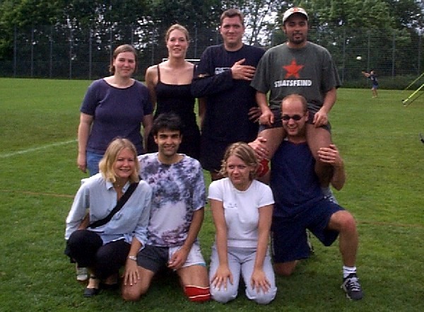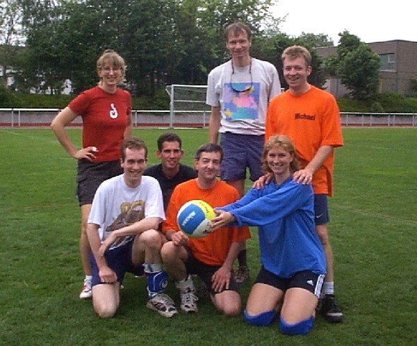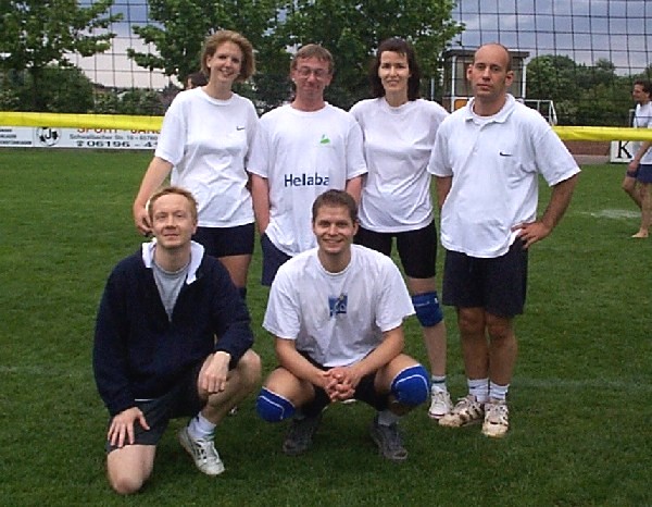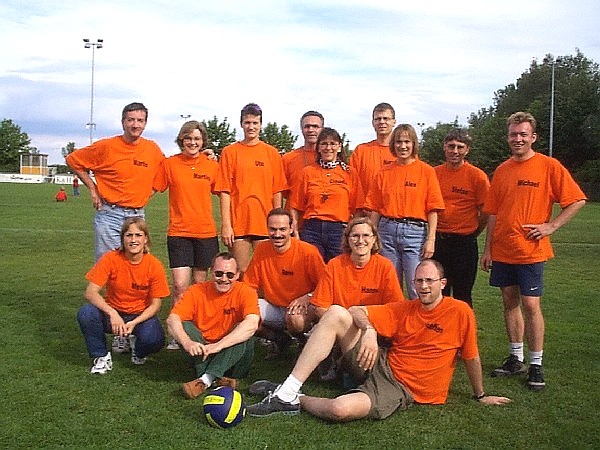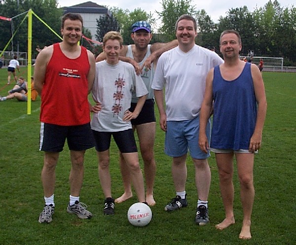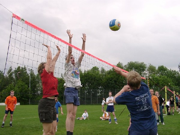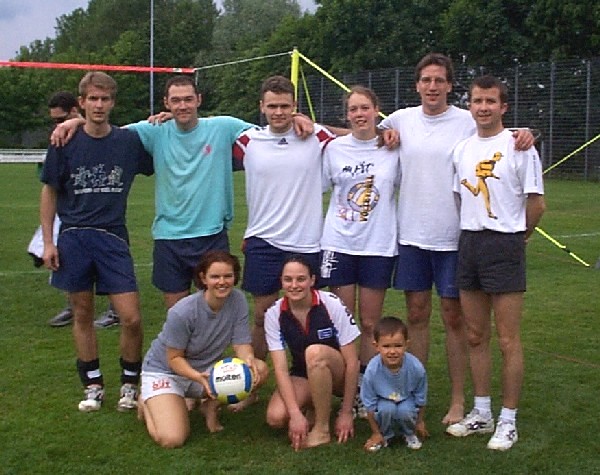 | Doch fangen wir von vorne an. Nachdem im Jahre 2001 der Grand -Slam aus terminlichen und platztechnischen Gründen leider ausfiel, hatten wir den Termin für das diesjährige Pfingstwochenende sehr früh genehmigt bekommen. Das Orga -Team traf sich 3 - 4 mal vor dem Turnier, um wieder das übliche Procedere abzuklären. Da wir über die Jahre hinweg die Teilnehmerzahl langsam höher schraubten, wollten wir es auch dieses Jahr mit mehr Mannschaften auf uns nehmen, und setzten das Maximum auf 20 Teams. Dies bedeutet eigentlich nur eine größere logistische Leistung, die Arbeit an sich bleibt die gleiche. So wurden die Einkaufslisten erneuert, und ein paar eifrige Helfer des VCL liefen sich in gewissen Großmärkten die Füße platt und stopften ihre Autos voll. Dann war es endlich soweit, Freitag nachmittag = Aufbautag. |