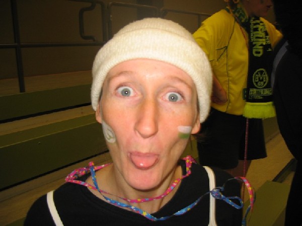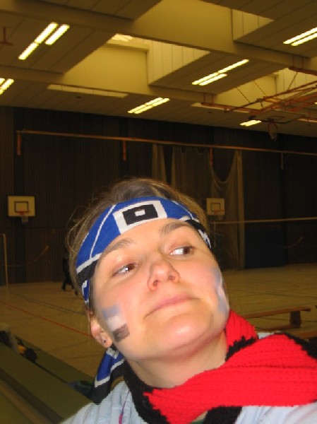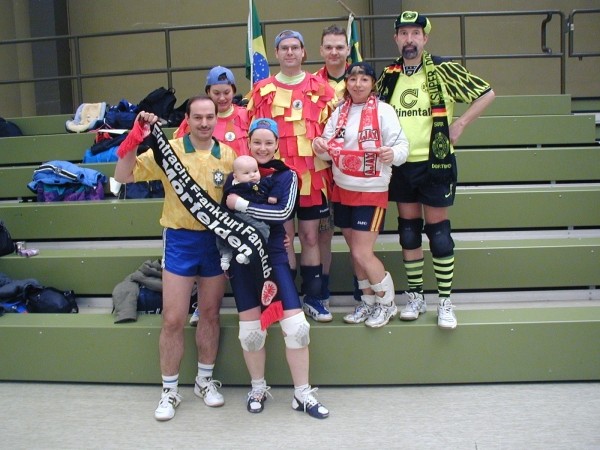Niederjosbach in Eppstein teil. Am Samstag, den 21. Februar 04 trafen sich 14 als Fußballfans verkleidete VCLer bereits um 8:45 Uhr - also zu nachtschlafender Zeit - an der Liederbachhalle. Bereits hier wurden die Flaggen geschwenkt und die Fangesänge geübt. Los ging es dann um 9:30 Uhr in Eppstein mit einer Polonaise und Einspielen bevor um 10 Uhr die Spiele offiziell begannen. |